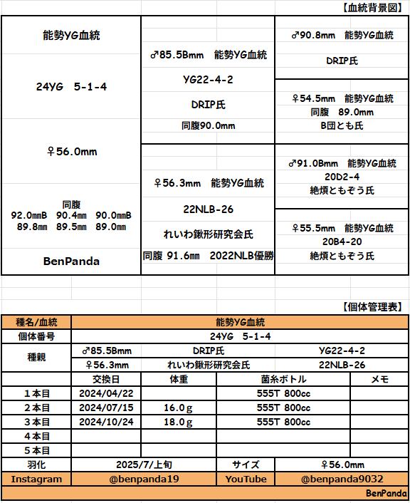 2025年度ブリードに5-1同腹早期♀を5ラインに使いましたが、4ラインでアベレージ40gオーバーが出ている期待のラインです。